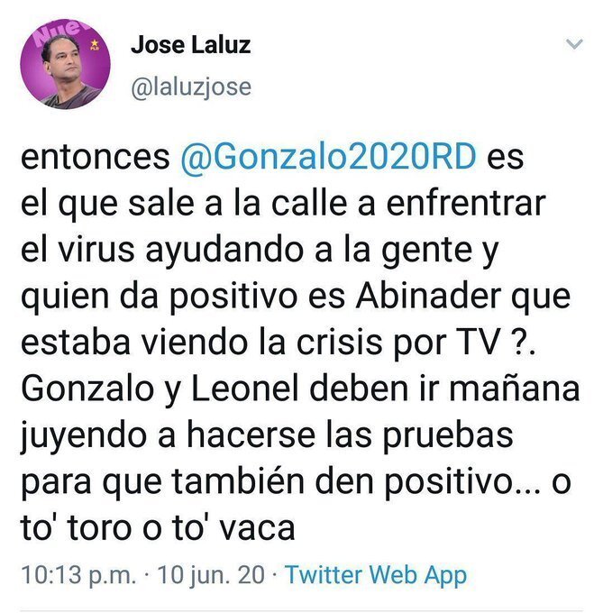 El diputado por el Partido de la Liberación Dominicana José Laluz dijo en su cuenta de Twitter que es injusto que quien haya dado positivo a la enfermedad del Covid 19 haya sido el candidato de la oposición Luis Abinader mientras que Gonzalo Castillo el candidato del partido de gobierno quien según el diputado es quien está trabajando del lado del pueblo para enfrentar la crisis no este infectado con esta terrible enfermedad.